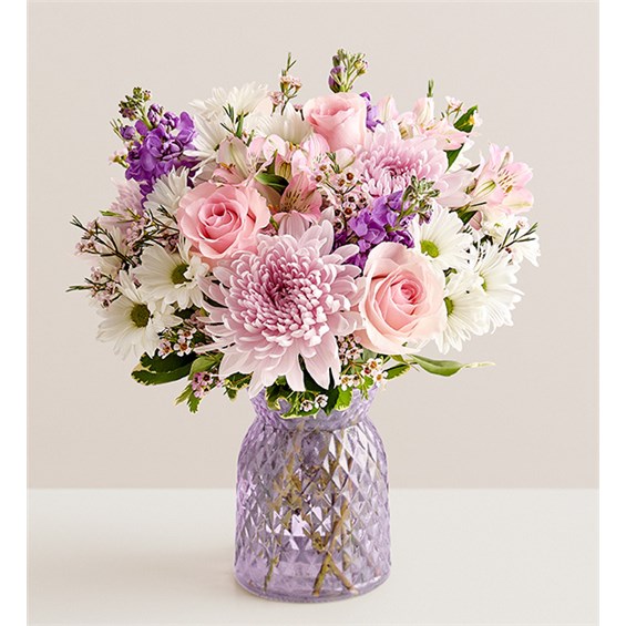 Inspired by the beauty of a blooming backyard garden, our bouquet is as amazing as Mom. Our florists arrange roses, Peruvian lilies, and other blooms in a lavender vase that accentuates the beauty of the pink petals. All-around arrangement of pink roses, Peruvian lilies (alstroemerias), cremons, and waxflower; white daisy poms; and greenery; medium and large include lavender stock as well Artistically designed in our embossed lattice vase, delicately cinched and finished in translucent lavender; measures 6.3""H x 7.7""Dia To ensure lasting beauty, Peruvian lilies may arrive in bud form and will fully bloom over the next few days Our florists hand-design each arrangement, so colors and varieties may vary due to local availability