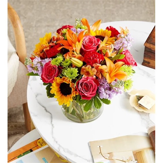 Like a warm embrace, our vibrant flower bouquet delivers your sentiments to someone special. A rich gathering of yellow and orange blooms, with pops of bright pink and purple, it's more than a gift… it's a way to express how you feel. Opt to have them delivered in kraft paper with a raffia bow or designed in a glass vase.